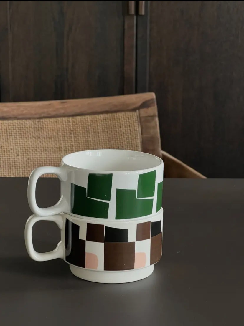 Tazza impilabile in ceramica smaltata con disegno grafico marrone e rosa : non senti già il profumo di caffè nero bollente o di quella tisana digestiva dopo sette fette di torta?