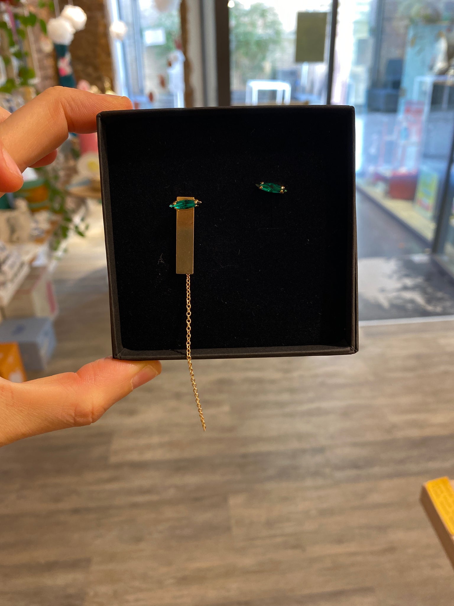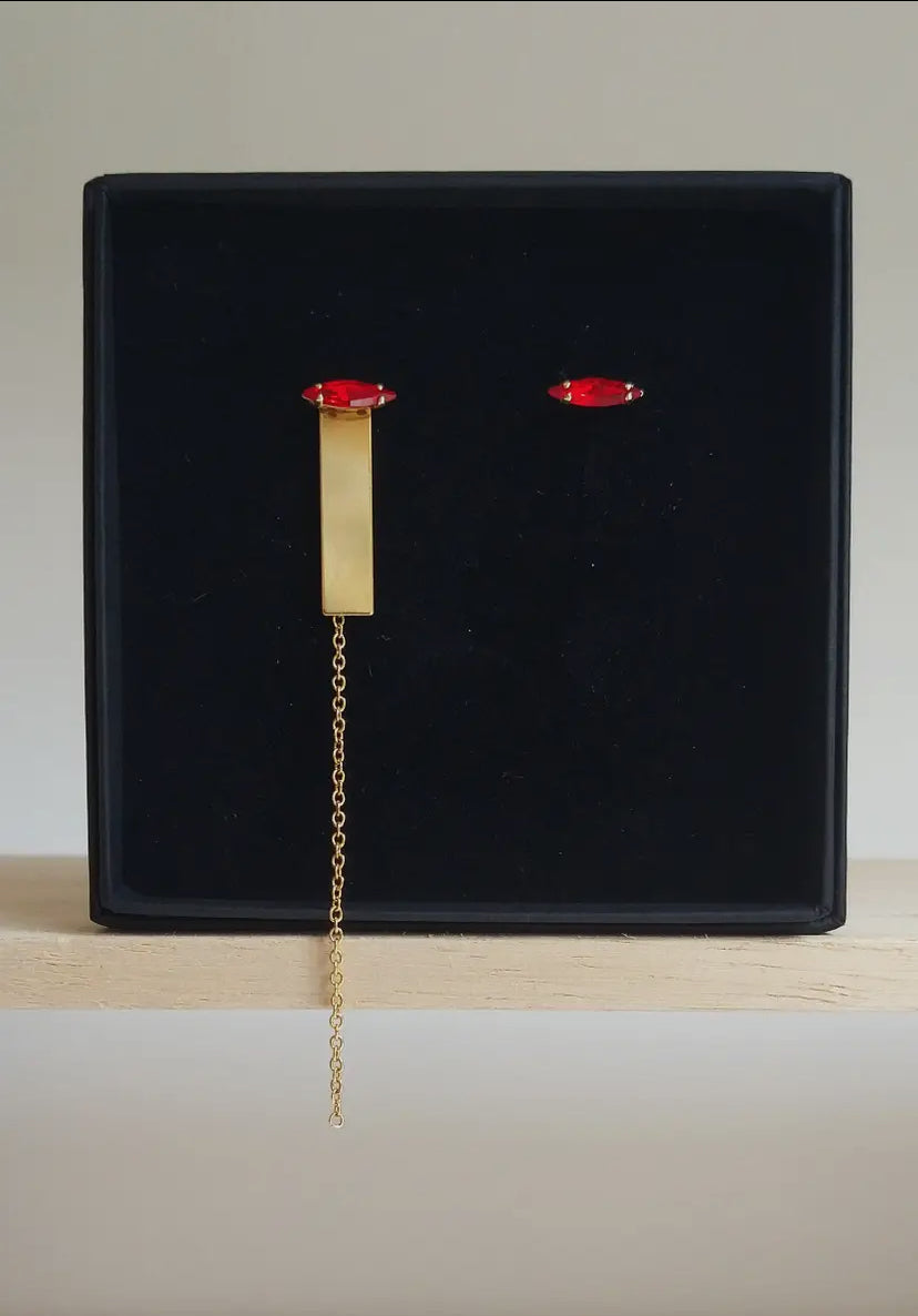 Orecchini asimmetrici, realizzato a mano a Barcellona in ottone placcato oro 2 micron e rifiniti con un cristallo di vetro, rosso intenso o verde brillante